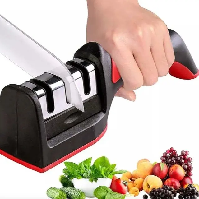 Mantén tus cuchillos siempre listos en tres simples etapas: preparación, afilado fino y pulido final. Su diseño compacto y ligero con base antideslizante y mango ergonómico garantiza un uso seguro y cómodo.