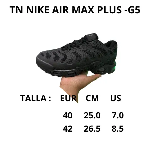 Potencia en cada paso.  Las Nike Air Max Plus TN G5 son puro estilo, comodidad y actitud . Su diseño agresivo y su amortiguación icónica te dan la fuerza para destacar en la calle y sentirte imparable.