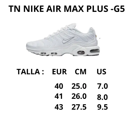 ✨ Potencia en cada paso. Las Nike Air Max Plus TN G5 son puro estilo, comodidad y actitud . Su diseño agresivo y su amortiguación icónica te dan la fuerza para destacar en la calle y sentirte imparable.